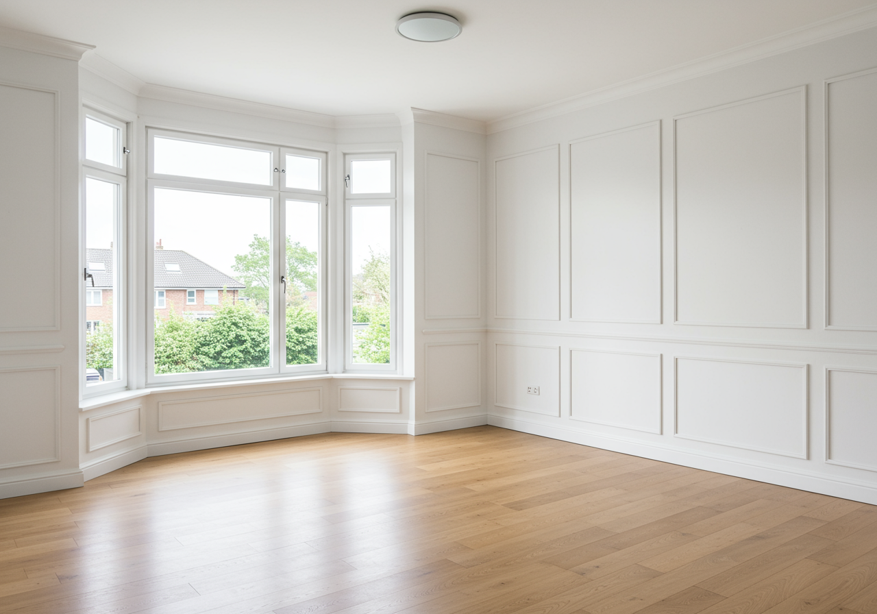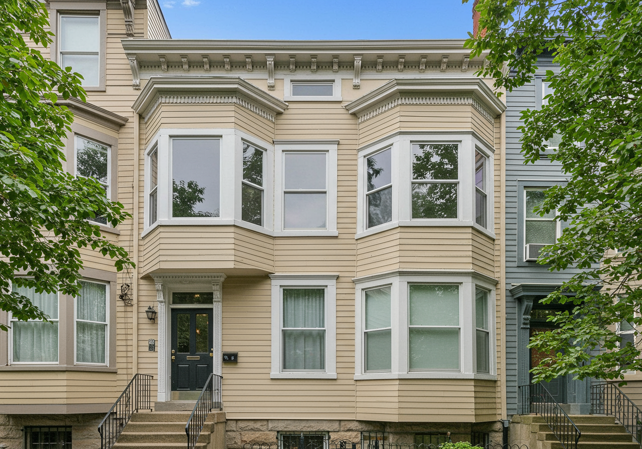 The third bedroom is flexible use, and can act as a formal dining room- featuring a built-in hutch, wainscot walls, a large bay window, and picture rails